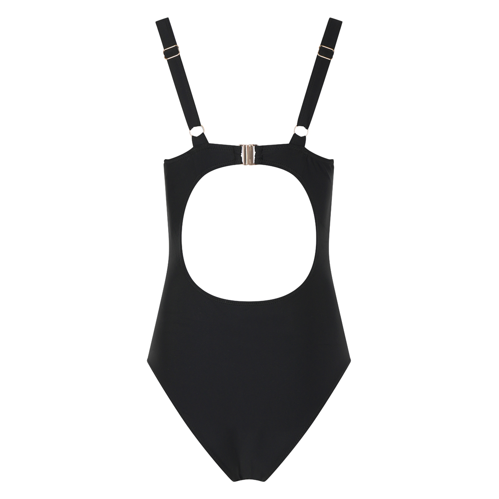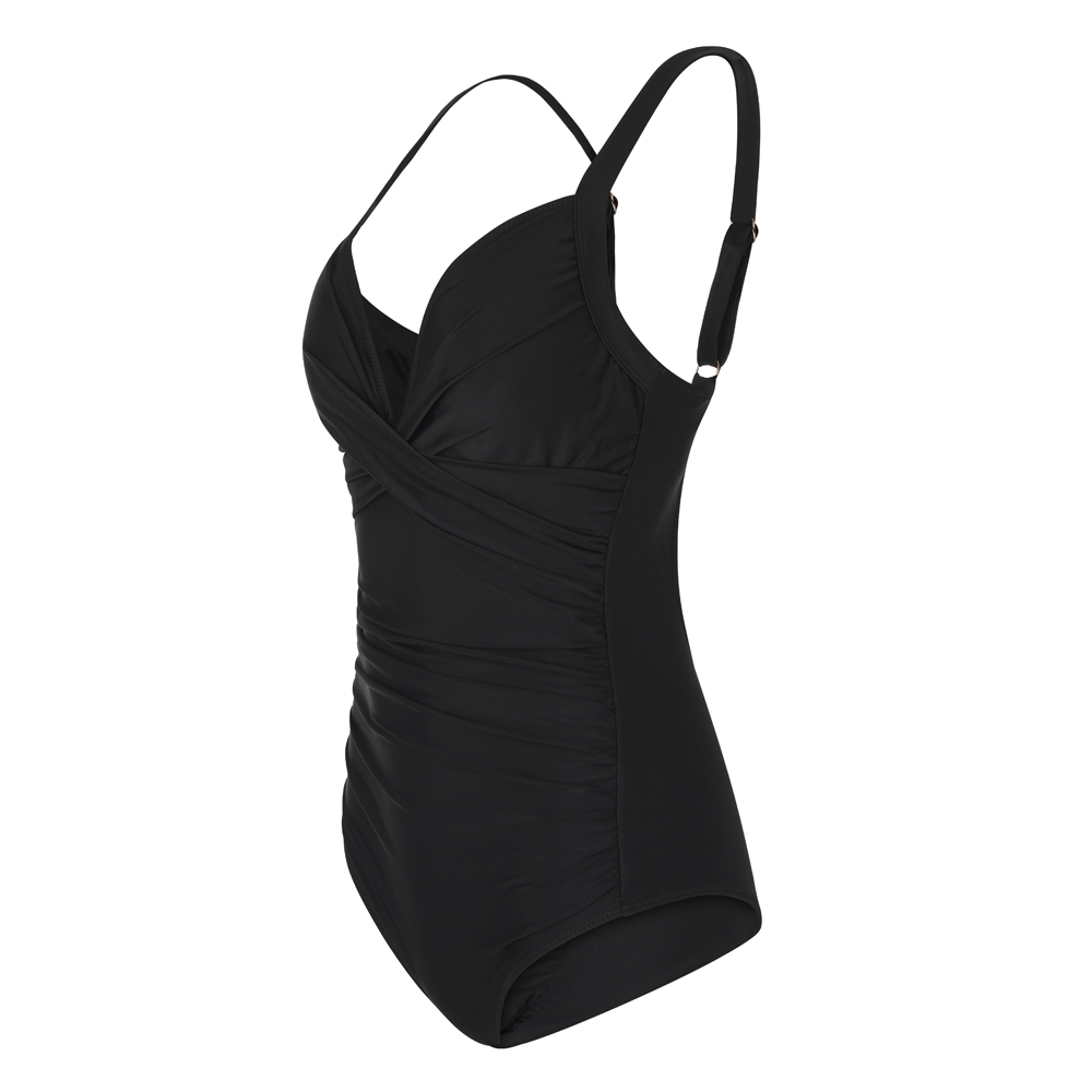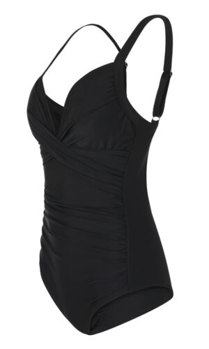 Το structured μπούστο με ενσωματωμένα cups προσφέρει στήριξη και ασφάλεια, ενώ η διακριτική draped γραμμή στο σώμα σμιλεύει τη σιλουέτα με φυσικό τρόπο. Οι ρυθμιζόμενες τιράντες και το σταθερό κούμπωμα στην πλάτη εξασφαλίζουν άνεση και τέλεια εφαρμογή.